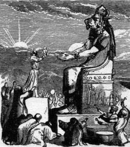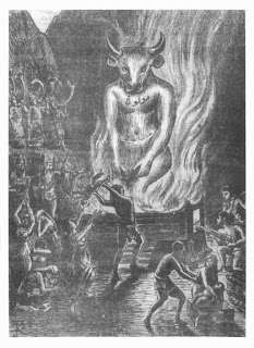 Moloch era, ao mesmo tempo, um fogo purificador destruidor, e consumidor. Os amonitas , membros de tribo a leste do Jordão, descendentes de Amon , que derrotaram os gigantes de Zomzomins e ocuparam a região, costumavam adorá-lo , para obterem boas colheitas e vitória nas guerras.Em algumas pinturas e esculturas, Moloch foi mundo confundido com o Minotauro, para ver a postagem...
