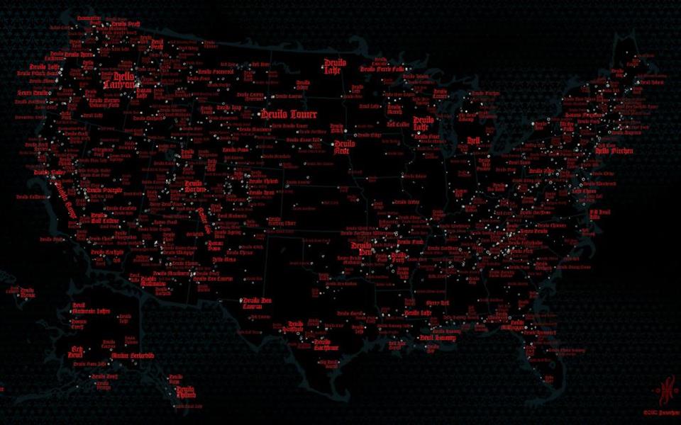 O resultado foi totalmente compilado em um mapa gigante (que você pode visualizar em altíssima qualidade nesse link) que traz a localização de cada um dos lugares diabólicos e deixa claro que os Estados Unidos estão cobertos de referências ao inferno.